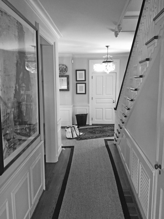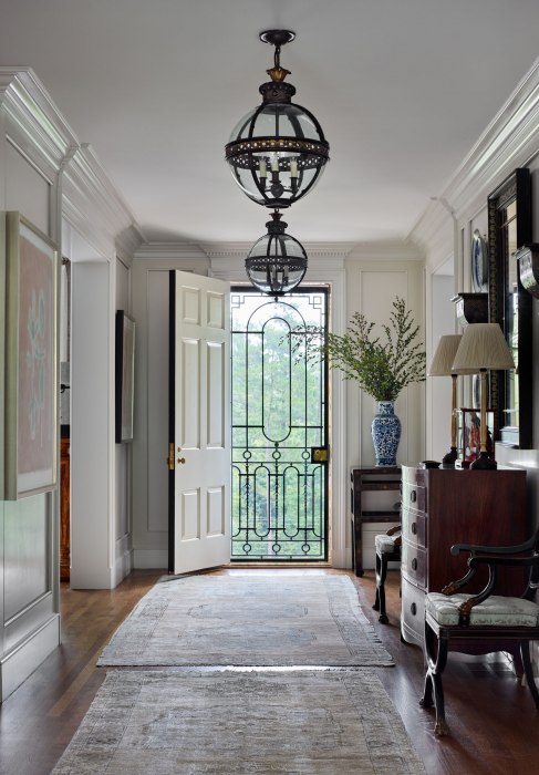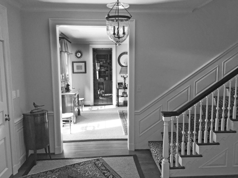 Once dark and confined, the entry hall is now open and appropriately scaled. With the staircase removed, the opening to the original sitting room was expanded. The new millwork in the entry hall echoes the grandeur of the sitting room’s formal trim.
