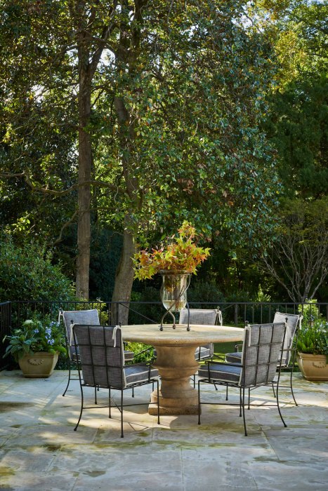 Casual and formal outdoor spaces surround the new conservatory. Inspired by orangeries of the past, the conservatory is now the centerpiece of the garden.