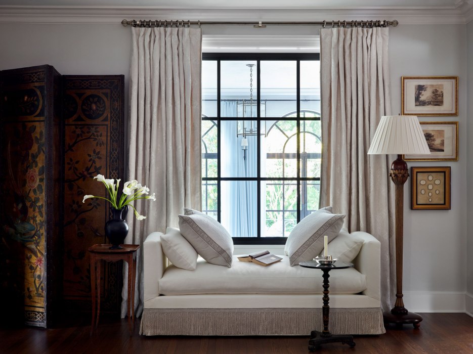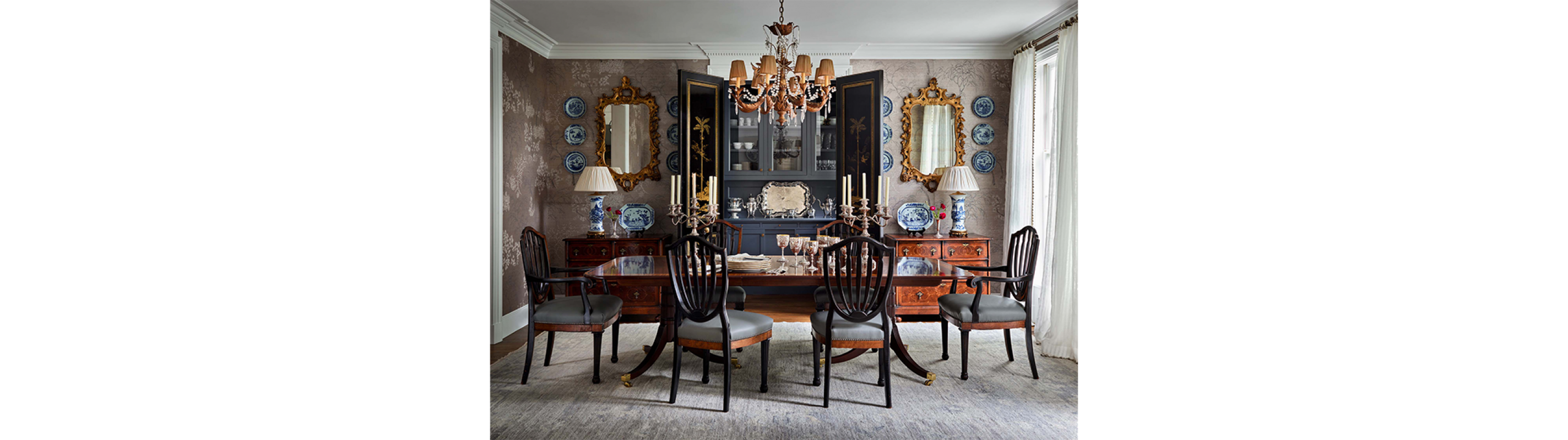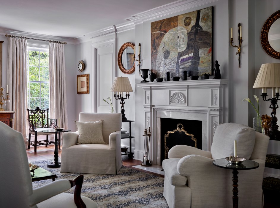THE SITTING ROOM was given a modern refresh. On what was once the sitting room’s exterior rear wall, a bay window was replaced with an interior partition window that overlooks the newly added Conservatory. This feature visually connects the spaces and allows them to share light.