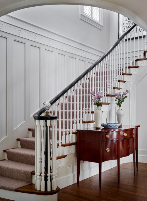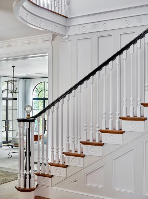 Classical detailing and fresh colors give this traditional stair a timeless and modern appeal.