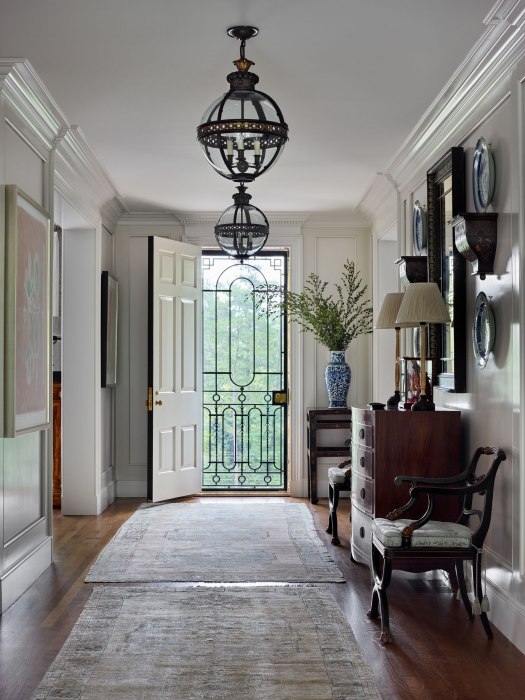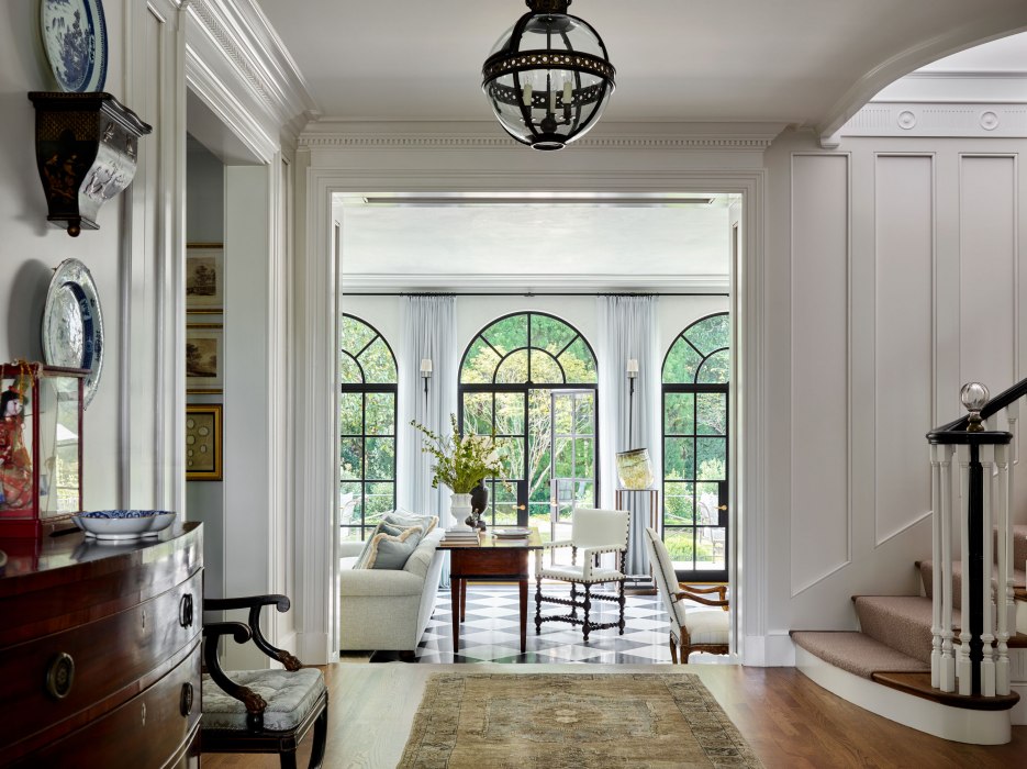 With the stair relocated, a gracious entry hall offers views through the newly added conservatory to the gardens beyond.